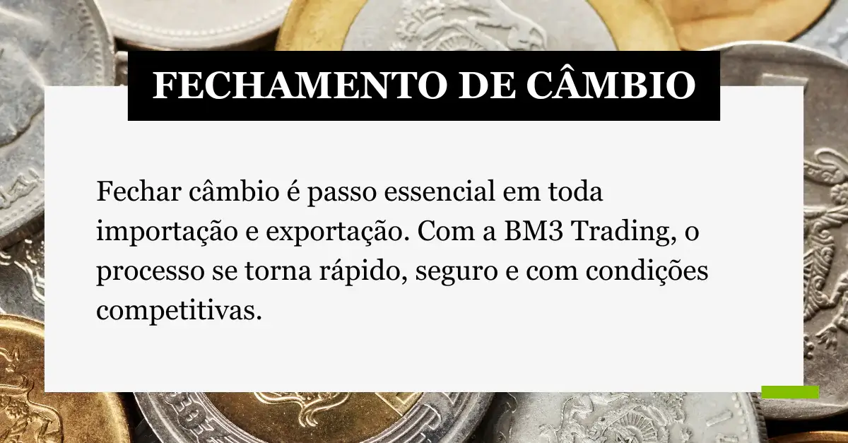 Na BM3 Trading, cuidamos de todo o processo de fechamento de câmbio, desde o cadastro até a liquidação, garantindo que sua empresa esteja sempre em conformidade com as normas vigentes.