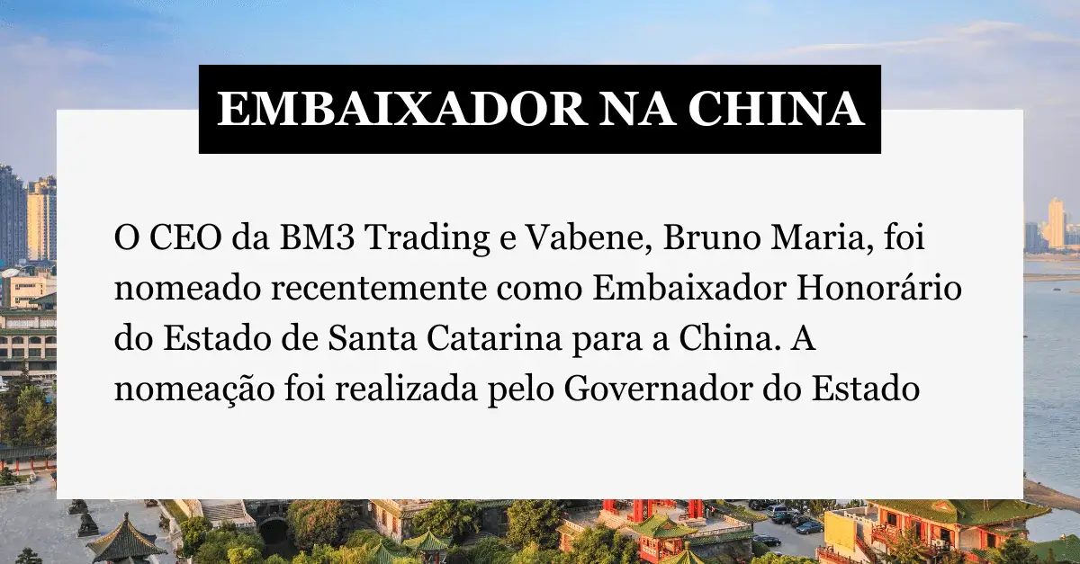 O CEO da BM3 Trading e Vabene, Bruno Maria, foi nomeado recentemente como Embaixador Honorário do Estado de Santa Catarina para a China. A nomeação foi realizada pelo Governador do Estado e representa não apenas um reconhecimento individual, mas um avanço institucional na construção de pontes sólidas entre o setor produtivo catarinense e o maior parceiro comercial do Brasil.